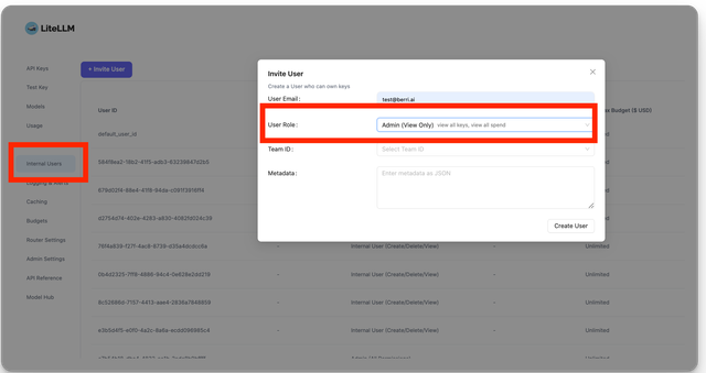 • internal_user: can login, view/create/delete their own keys, view their spend. Cannot add new users.
